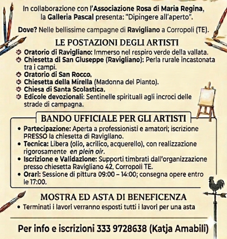 Il fascino della pittura en plein air torna a colorare la Val Vibrata. Il prossimo 2 giugno 2026 (martedì) la Galleria A&A Pascal, in stretta collaborazione con il G. d. P. – Associazione Rosa di Maria REGINA APS-ETS , darà vita alla quarta edizione di “Dipingere all’aperto”, un evento che trasformerà le campagne di Ravigliano in un vero e proprio atelier a cielo aperto.