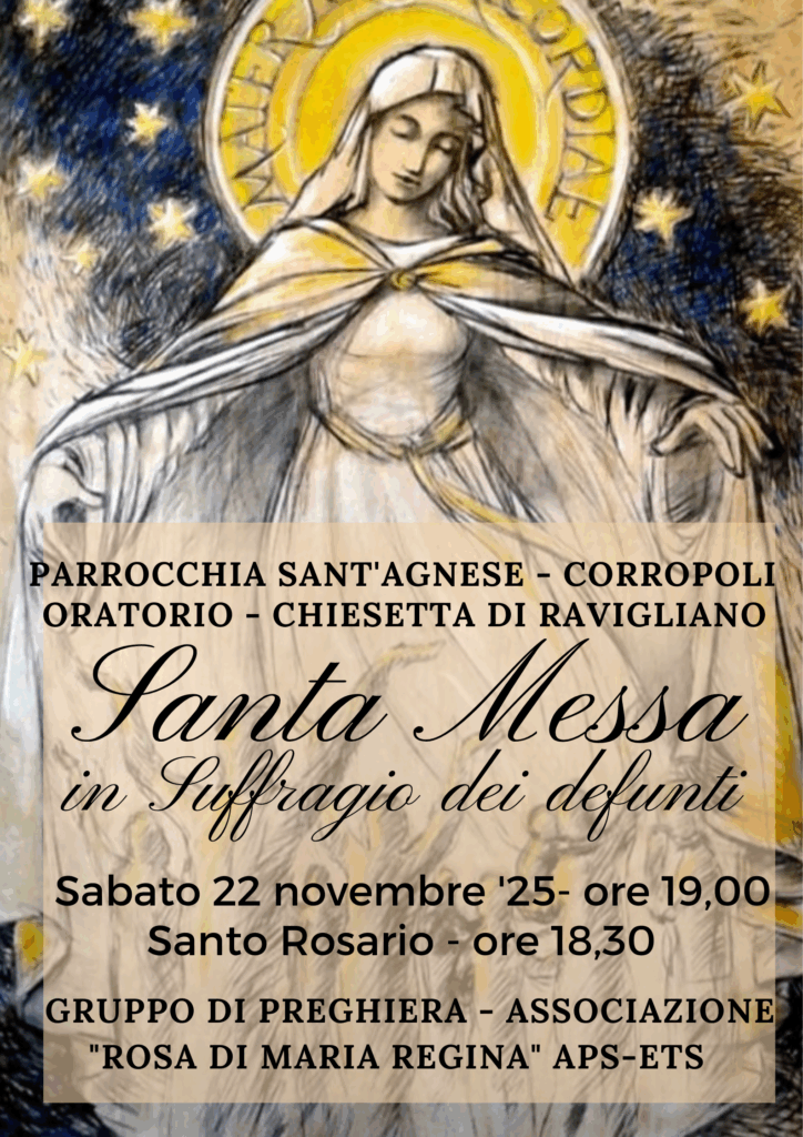 La Parrocchia Sant’Agnese di Corropoli e il Gruppo di Preghiera – Associazione “Rosa di Maria Regina” APS-ETS, sono lieti di invitare i fedeli a una speciale celebrazione in suffragio.